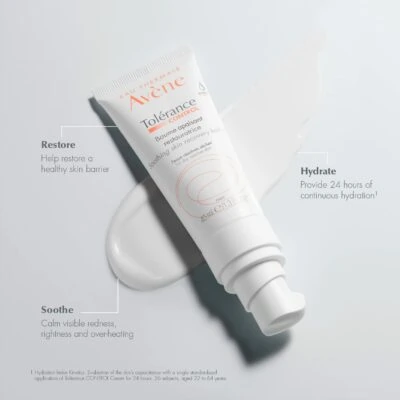 Le Baume Apaisant Restaurateur Tolérance Control de Avène est formulé pour les peaux hypersensibles, réactives, intolérantes ou même allergiques. Au coeur de sa formule, un actif postbiotique ultra-calmant breveté issu de l’eau thermale d’Avène, le D-Sensinose™, qui va permettre de calmer instantanément les rougeurs, les tiraillements, les picotements et les sensations d’échauffement. L’eau thermale d’Avène est connue pour ses vertus apaisantes et hydratantes ce qui permet de renforcer l’efficacité de ce soin.