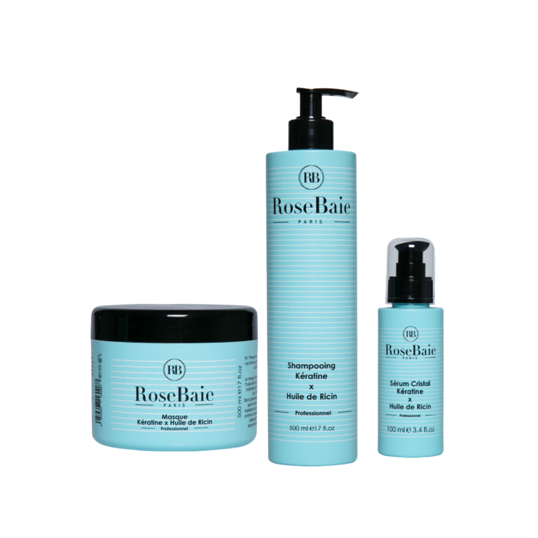 Trio shampoing, masque et sérum traitant hydratant et protecteur à la kératine et l’Huile de Ricin.