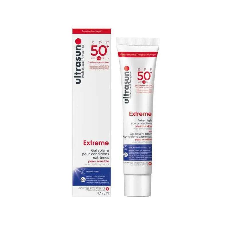 ULTRASUN Extrême Gel Solaire SPF50+ 75ml est destiné pour les peaux ultra sensibles à absorption rapide, non gras et non collant, contenant de la SOD (anti-radicaux libres), de la vitamine E et de la provitamine B5. Idéal dans les conditions d’ensoleillement extrêmes.